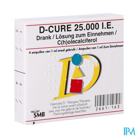 D-Cure 25.000 U.I. : Une ampoule de 1 ml contient 0,625 mg de cholécalciférol (vit. D3), équivalent à 25.000 U.I.